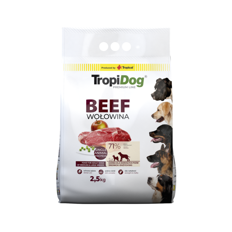 TropiDog Premium Adult MEDIUM & LARGE BREEDS – Rich in BEEF to karma Premium bogata w wołowinę dla dorosłych psów średnich ras (od 12. miesiąca życia) i dużych ras (od 15. miesiąca życia). Kompozycja oparta na jednym źródle białka zwierzęcego przeznaczona jest szczególnie dla psów z wrażliwym układem pokarmowym.