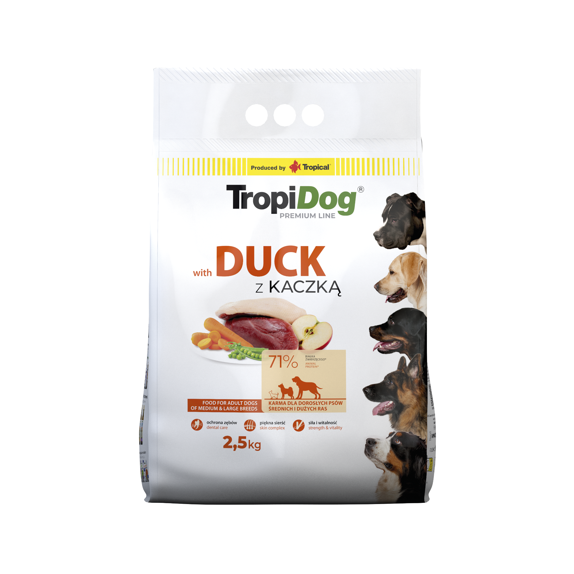 TropiDog Premium Adult MEDIUM & LARGE BREEDS – with DUCK and RICE to karma premium z kaczką i ryżem dla dorosłych psów średnich ras (od 12. miesiąca życia) i dużych ras (od 15. miesiąca życia)