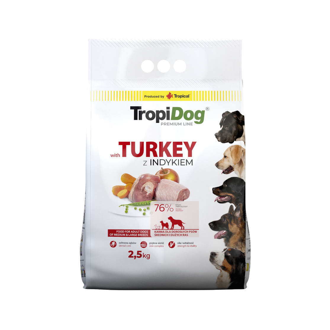TropiDog Premium Adult MEDIUM & LARGE BREEDS – with TURKEY to karma Premium z indykiem dla dorosłych psów średnich ras (od 12. miesiąca życia) i dużych ras (od 15. miesiąca życia).
